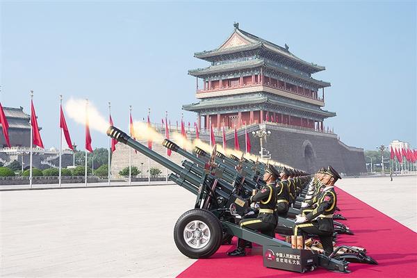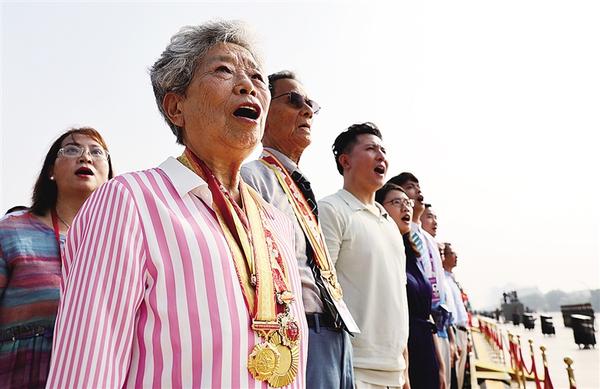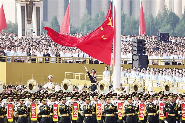 全体肃立,80响礼炮震彻云霄,国旗护卫队官兵护卫着五星红旗,迈着矫健的步伐,从人民英雄纪念碑行进至广场北侧升旗区。中国人民解放军联合军乐团奏响雄壮的《义勇军进行曲》,全场齐声高唱中华人民共和国国歌,鲜艳夺目的五星红旗冉冉升起,在天安门广场上空高高飘扬。