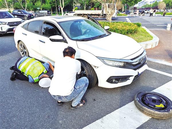 了解情况后,刘奎立即从警车上取来工具,俯身跪地,与司机一同更换轮胎。几分钟后,轮胎更换完毕,司机将驾驶车辆顺利开到规划好的停车位上。刘奎顾不上擦去额头的汗水,迅速返回岗位,继续投入交通疏导工作。