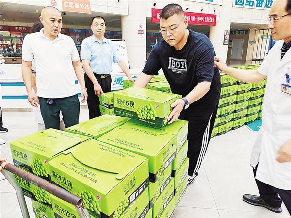9月7日下午,来自黄泛区农场的时先生(右二)将270箱自家农场种植的葡萄捐赠给周口港区医院,与医护人员一起分享双重喜悦:自家果园的丰收和他个人的身体康复。