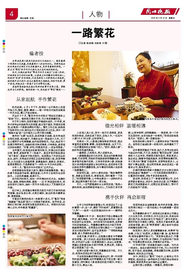 近日,本报记者专访“繁花手作中式糕点”主理人陈丽,听她讲述自己的创业故事。从家庭主妇到餐饮品牌创始人,陈丽的“转身”并非偶然,而是坚持匠心与梦想的必然结果。她的经历启示我们:创业之路固然充满挑战,但坚守热爱、勇于尝试,终能走出一条属于自己的繁花之路。