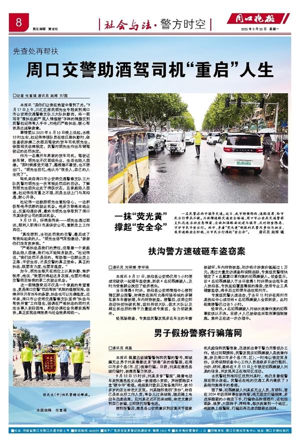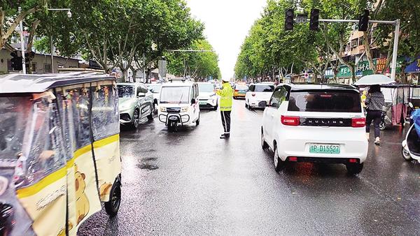 一名民警在雨中疏导交通。近日,我市持续降雨,道路湿滑,给市民出行带来不便。为保障道路交通安全畅通,周口市公安局交通警察支队迅速启动应急预案,全面加强路面巡逻与疏导,及时排查隐患,守护市民平安出行。雨中,身着“荧光黄”制服的民警用责任与担当,筑牢道路安全防线,为市民出行撑起“安全伞”。通讯员 赵辉 摄