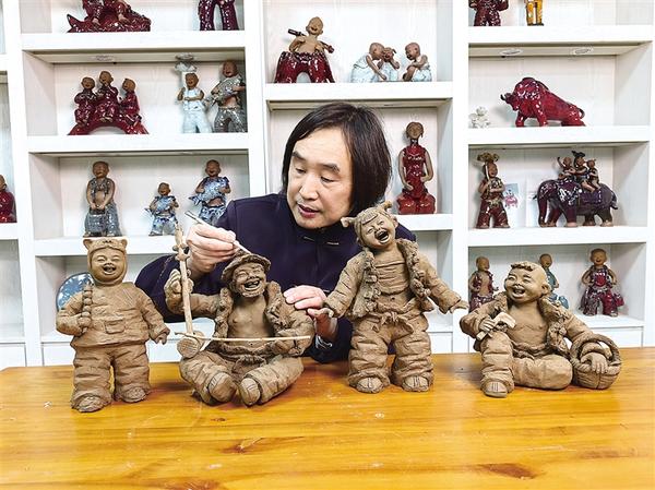 “双节”前夕,鹿邑籍人士、省级非遗传承人梁加付(中)带领学员创作了以“欢度国庆”“家乡新貌”为主题的剪纸作品。记者 侯国防 通讯员 宋福利 摄