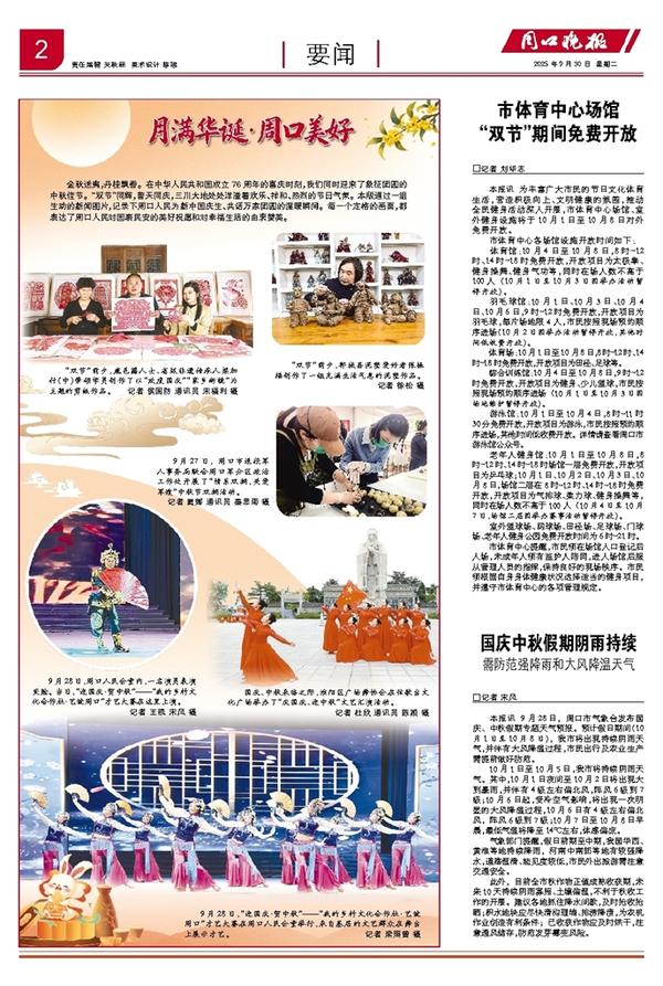 本报讯 9月28日,周口市气象台发布国庆、中秋假期专题天气预报。预计假日期间(10月1日至10月8日),我市将出现持续阴雨天气,并伴有大风降温过程,市民出行及农业生产需提前做好防范。