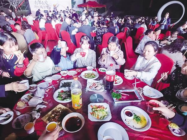 19时整,家宴准时开席。泰地现代城销售经理邱聪慧带领销售员发放饮品。她笑着说:“这是办喜事的标配,果汁、雪碧、可乐,一瓶都不能少。”传菜、上菜,于金卫带领30多名物业人员各司其职。20个佳肴按次序上桌,现场饭香四溢,家宴其乐融融。