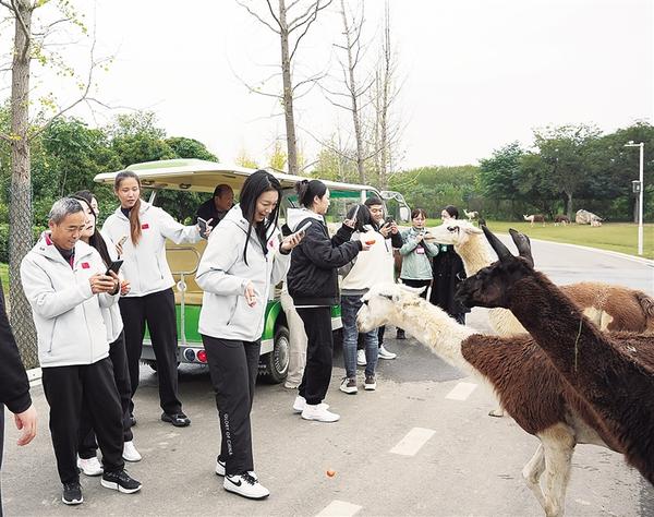 人和动物的互动更显温馨、热闹。羊驼甩着蓬松绒毛凑近人群,队员们笑着递上饲料,温柔抚摸它的背部。在驯兽员的协助下,队员们拿出排球与小熊互动。小熊笨拙地抬起爪子拍打排球,憨态可掬的模样引得队员们笑声连连。