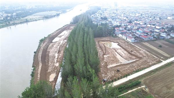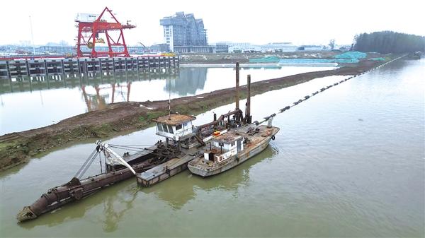 10月16日上午,周口中心港小集作业区港池外,清淤船整装待发,随时准备投入作业(右下图)。据了解,周口中心港小集作业区一期首批4个岸机安装完毕,港池已建好并蓄水,接下来,将对港池进行清淤作业,为开港投产做准备。一个现代化大港已经初现。记者 梁照曾 摄