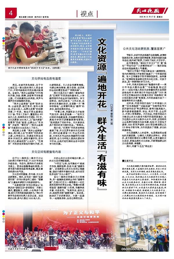 我市始终坚持以文化人、以文惠民、以文润城、以文兴业,把加强公共文化服务作为实现人民基本文化权益的主要途径,加快建设和完善公共文化服务体系,完善文化馆、博物馆、图书馆、美术馆等公共文化场所的硬件设施,积极推动文化资源下沉,让优质文化资源直达基层;同时,加强数字化建设,搭建线上文化服务平台,为群众提供便捷、高效的文化服务,切实增强了人民群众的文化获得感和幸福感,也为周口经济社会高质量发展注入了动力。