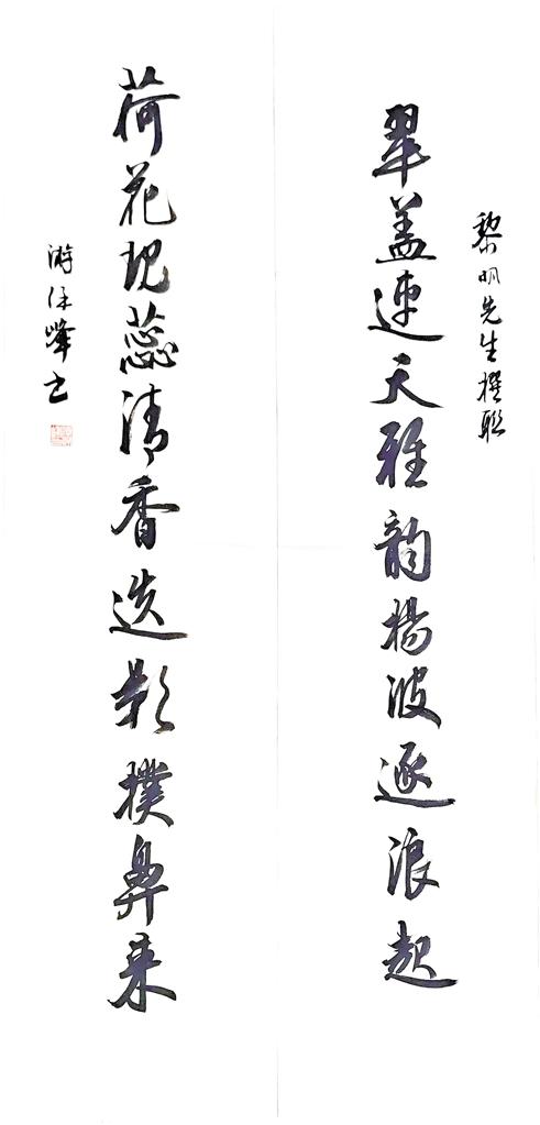 翠盖连天,雅韵扬波逐浪起; 荷花现蕊,清香迭影扑鼻来。