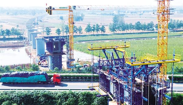 10月22日,周口中心港集疏运铁路专用线(简称专用线)控制性工程——跨宁洛高速特大桥正紧张施工。该桥全长3196.07米,施工单位目前正加紧建设跨宁洛高速176米连续梁等重点部位。
