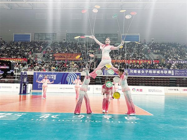 赛前的文体表演环节亮点纷呈。在开封市体育馆,周口杂技表演《花盘》惊艳全场——演员娴熟操控多个旋转花盘,动作行云流水、姿态优雅灵动,在紧凑节奏中完美融合力与美,尽显深厚的文化底蕴;在商丘市体育馆,老子故里的《道·生乐》表演生动演绎了“道”文化,展现天人合一、乐舞相生的意境,尽显中原文明的悠远智慧,营造了热烈和谐的氛围。