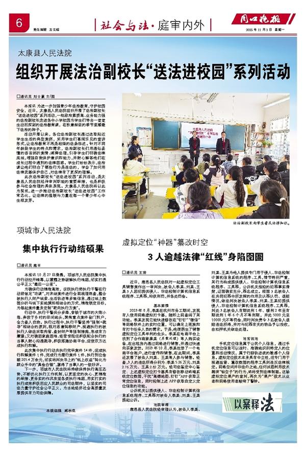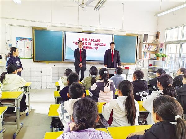 本报讯 为进一步加强青少年法治教育,守护校园安全,近日,太康县人民法院组织开展了法治副校长“送法进校园”系列活动,一批政治素质高、业务能力强的法治副校长走进各中小学校园为学生们带去一堂堂生动而深刻的法治教育课,在秋意渐浓的季节里播撒下法治的种子。