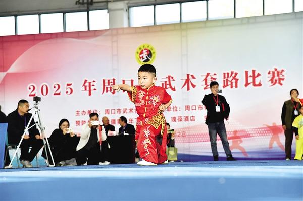 11月1日上午,小朋友展示长拳。当日,由周口市武术协会主办、周口市体育中心协办的“2025年周口市武术套路比赛”在周口市体育中心开赛,来自全市不同武术门派和拳种的43支代表队的千名武术爱好者参与套路、器械等比赛,他们的扎实功底和不同风格的拳术展示赢得阵阵喝彩,展示了我市武术发展的成果。