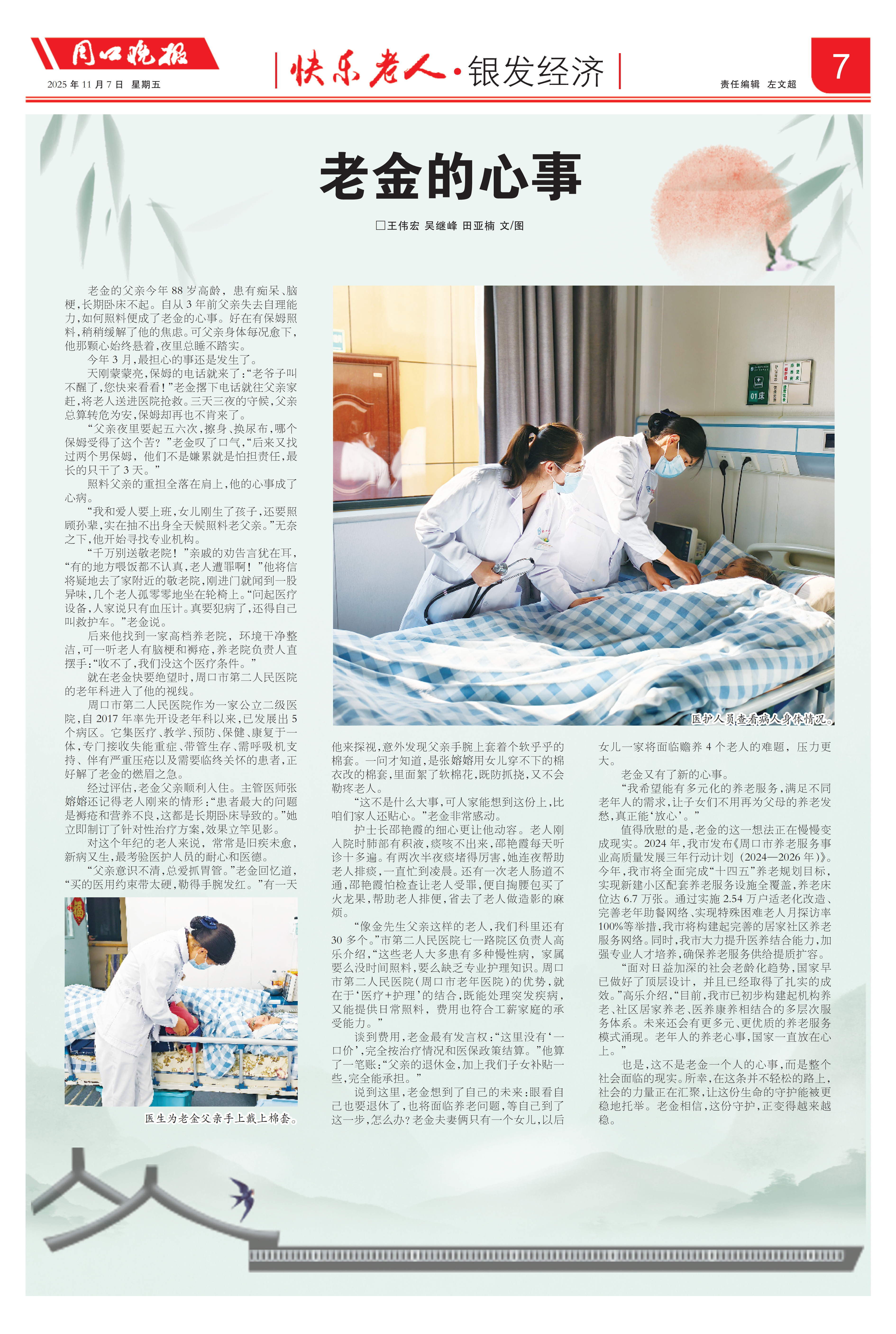 “像金先生父亲这样的老人,我们科里还有30多个。”市第二人民医院七一路院区负责人高乐介绍,“这些老人大多患有多种慢性病,家属要么没时间照料,要么缺乏专业护理知识。周口市第二人民医院(周口市老年医院)的优势,就在于‘医疗+护理’的结合,既能处理突发疾病,又能提供日常照料,费用也符合工薪家庭的承受能力。”