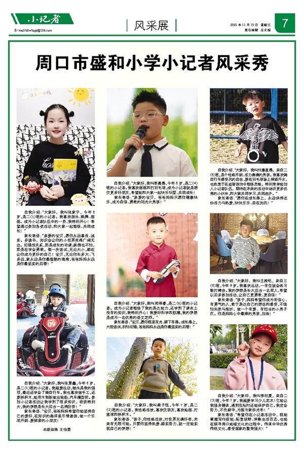 自我介绍:“大家好,我叫李初夏,来自二(3)班,今年7岁。我超爱学习少儿武术!它能让我强身健体,遇到危险时还能保护自己。我定会努力,不负韶华,为国为家添光彩!” 家长寄语:“希望你在小记者活动中,既能掌握写作技能、拓宽视野、洞察生活百态,也能在探寻周口地域文化的过程中,传承中华优秀传统文化,感受国家的繁荣强大!”