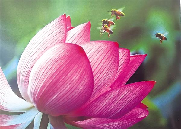 为了捕捉群蜂采蜜的鲜活画面,田维国不顾荷塘水深,在水中不断挪动身姿,变换了数十个拍摄角度。尽管被蚊虫叮咬、蚂蝗侵扰,身上青一块紫一块,他却丝毫未受影响。最终,他用镜头留住了蜂逐花香的热闹场景,成就了《清风送香蜂自来》这帧佳作。