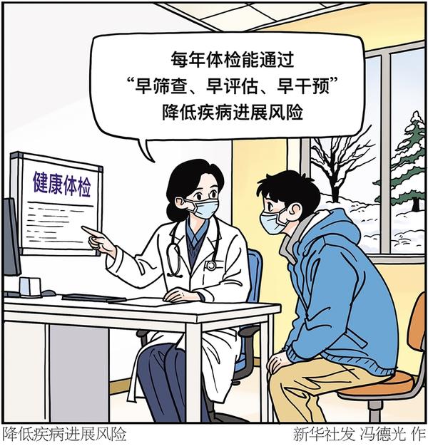 12月12日是国际全民健康覆盖日。健康体检是了解自身健康状况、早期发现疾病线索和健康隐患的重要手段。“去年刚体检过,没问题,今年就不用体检了吧?”这是大家对健康体检的常见误解。专家表示,疾病是动态发展的,多数慢性病和肿瘤早期无明显症状,每年体检能通过“早筛查、早评估、早干预”降低疾病进展风险。即使是健康人群,也可通过体检跟踪身体指标变化,及时调整生活习惯。 新华社发 冯德光 作
