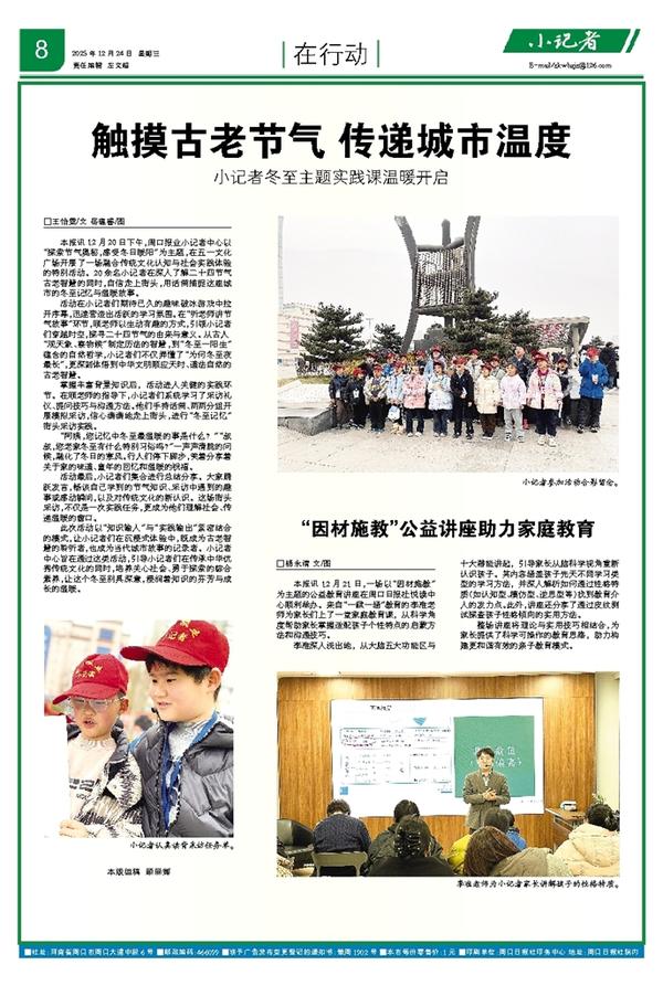 本报讯 12月20日下午,周口报业小记者中心以“探索节气奥秘,感受冬日暖阳”为主题,在五一文化广场开展了一场融合传统文化认知与社会实践体验的特别活动。20余名小记者在深入了解二十四节气古老智慧的同时,自信走上街头,用话筒捕捉这座城市的冬至记忆与温暖故事。