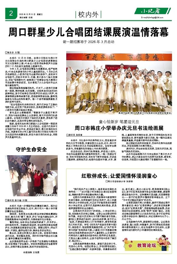 本报讯 12月26日晚,由周口日报社与周口市文化馆联合打造的周口群星少儿合唱团结课展演在市文化馆精彩上演,40余名小团员用纯净歌声为这场历时7个月的音乐旅程画上圆满句号。