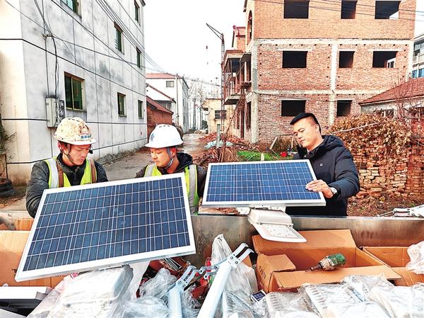 近日,在商水县黄寨镇后王村,工人准备安装太阳能路灯。据了解,黄寨大嫂食品公司王中亚、胡玉龙二人出资3万余元,为该镇后王村的6条主干道安装了崭新的太阳能路灯,既点亮了乡村的夜色,也温暖了全体村民的心。记者 徐启峰 王吉城 摄