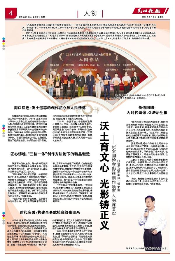 从豫东平原的三尺讲台到法治影像的广阔天地,陈复军用一个创作者的坚守证明:最动人的作品,既需扎根专业领域的厚土,更需扎根时代与人民的内心。他的创作,是中国法治进程的生动注脚,也是一位周口儿女以文心铸正义、以光影映时代的责任担当。