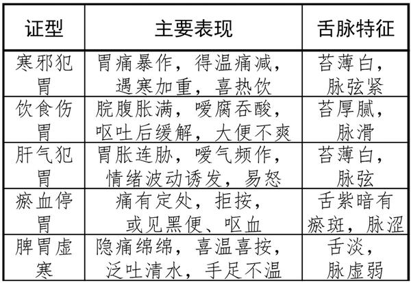 中医治疗讲究“辨证论治”,胃痛尤需分清寒热虚实。常见证型及其特点可参考下表。