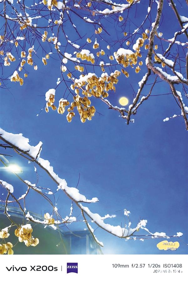 2026元旦的一片落雪,就这么粘在枝头,和月亮对望。