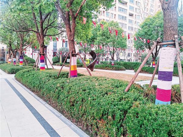 偌大的小区内,18栋住宅楼外立面清新简约,错落有致,巍然矗立。楼宇间,石材铺设的路面笔直平坦、宽敞整洁;路两侧,乔木、灌木、草皮等绿植组成多重景观,除少数大型落叶乔木外,其他都绿意盎然。连绵不断的龟背造型绿植景观带修剪整齐,有力地彰显着小区的绿化品质。主景观区里的灌木佩戴数以百计的紫红绢花,主通道两侧的乔木树干从地面到胸径裹着多彩的棉线,给冬日的小区增添了不少生机。