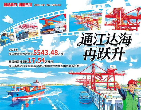 2025 年,周口港交出亮眼答卷:货物吞吐量 5543.48 万吨、集装箱吞吐量 17.54 万标箱,两项数据双双创下历史纪录,跻身全国 37 个港口型国家物流枢纽承载城市。依托 “1+9” 现代化港口体系,以中心港为龙头,9 个特色港区错位协同,织就 43 条国内外航线网络,形成全域覆盖的港口集群。这一枢纽优势正转化为产业引力,吸引粮食精深加工、装备制造等产业集聚,推动 “经济通道” 向 “通道经济” 加速转变。