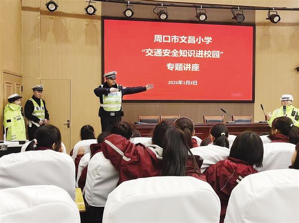 交警为师生和家长讲解交通安全知识。1月8日下午,周口市公安局交通警察支队三大队的民警走进周口市文昌小学,化身“安全讲师”,为全校师生及家长代表带来了一堂实用、丰富的交通安全课。通讯员 郭婷 摄