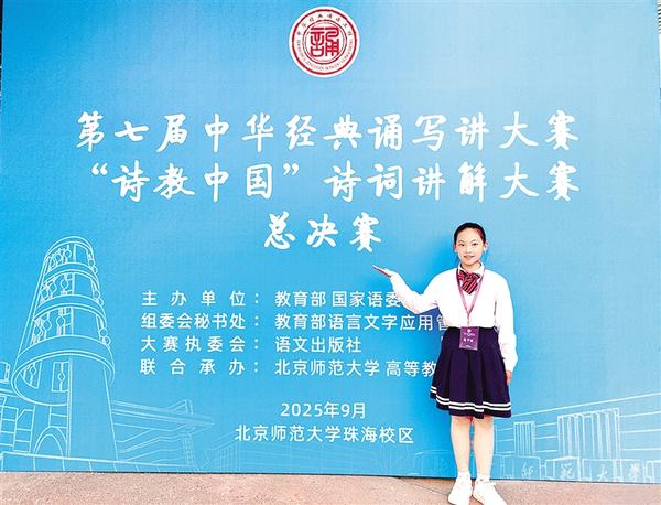 本报讯 近日,第七届中华经典诵写讲大赛暨“诗教中国”诗词讲解大赛全国总决赛成绩揭晓,周报小记者、周口市汉阳路学校马臻希同学凭借讲解作品《沁园春·长沙》脱颖而出,荣获小学组一等奖。