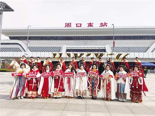 2月9日,身着汉服的舞蹈演员在高铁周口东站广场上带来灵动的快闪表演,传递周口文化韵味。