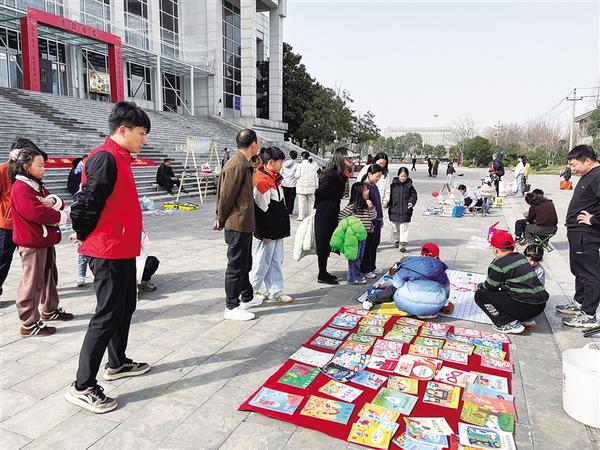 2月13日首场集市,小摊主们早早齐聚图书馆门前广场,创意布置专属摊位,推出套圈互动、个人画展等趣味形式,让书市充满童趣。