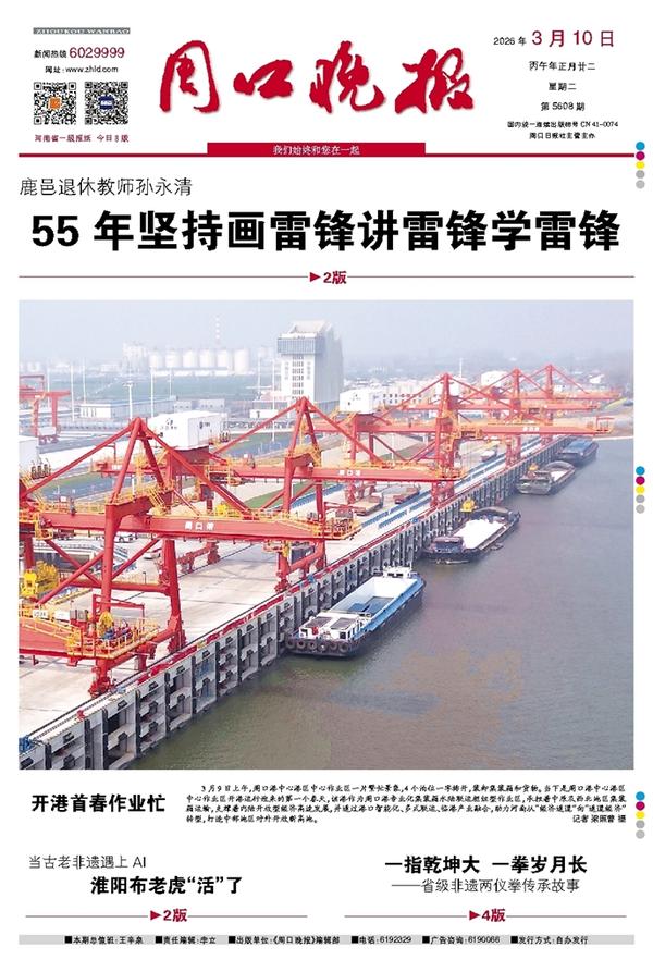3月9日上午,周口港中心港区中心作业区一片繁忙景象,4个泊位一字排开,装卸集装箱和货物。当下是周口港中心港区中心作业区开港运行迎来的第一个春天,该港作为周口港专业化集装箱水陆联运枢纽型作业区,承担着中原及西北地区集装箱运输,支撑着内陆开放型经济高速发展,并通过港口智能化、多式联运、临港产业融合,助力河南从“经济通道”向“通道经济”转型,打造中部地区对外开放新高地。记者 梁照曾 摄