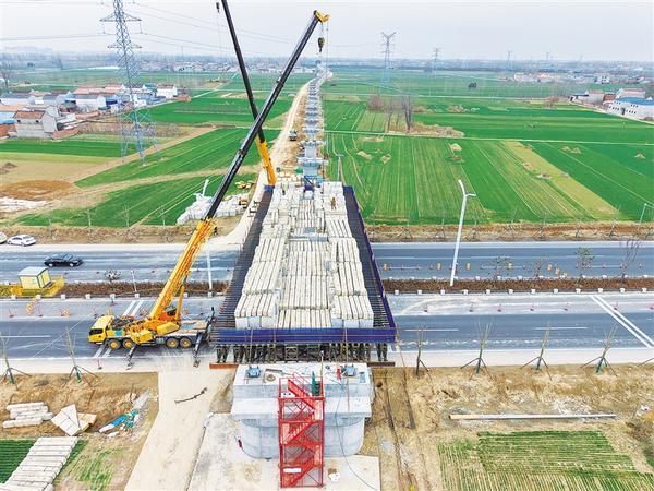 3月18日,在跨宁洛高速特大桥连续梁施工现场,30余名工人正在进行连续梁的钢筋焊接和混凝土浇筑施工。截至目前,项目桥梁工程总体进度已完成85%。按照施工计划,连续梁将于4月初完成合龙,为后续铺轨等工程奠定基础。记者 李瑞才 摄