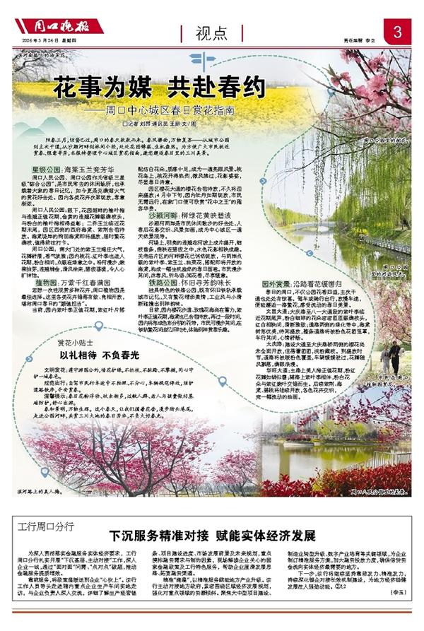阳春三月,惊蛰已过,周口的春天款款而来。春风拂面,万物复苏——从城市公园到主次干道,从沙颍河畔到林间小径,处处花团锦簇、生机盎然。为方便广大市民就近赏春、惬意寻芳,本报特整理中心城区赏花指南,邀您邂逅春日里的三川美景。