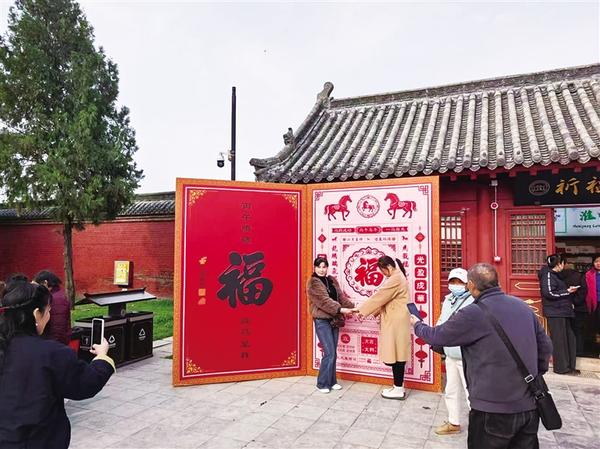 活动现场氛围热烈。入口巨型黄历成为打卡热点,游客纷纷驻足留影,纳福启运。祈福区里,龙云纹样祈福邮筒古韵十足,游客选购主题明信片、加盖专属文化日戳,将心愿投入邮筒,传统祈福与邮政文创巧妙结合,快乐满满。
