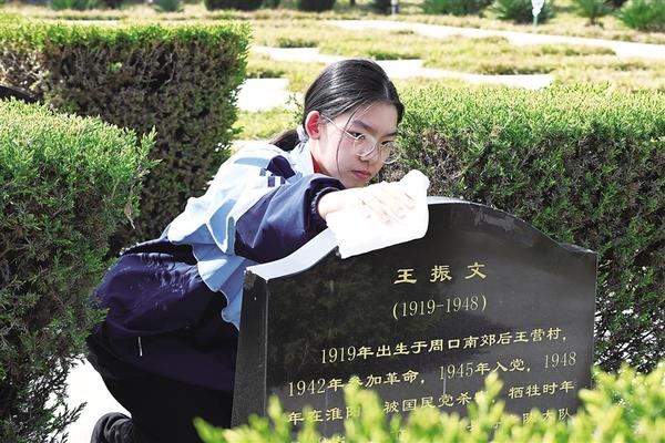 周口天立学校五年级学生石雨鑫用毛巾轻轻擦拭烈士墓碑。“最触动我的是马绍领爷爷的宣讲,战争的残酷超出想象。我们现在坐在明亮的教室里,吃穿不愁,都是因为他们替我们受了苦。”石雨鑫说,“传承英烈精神,从踏踏实实学好本领开始。”