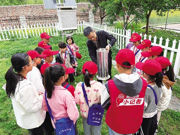 周六上午,小记者们在老师带领下来到周口市气象局。穿过科技馆后门,大家步入气象观测场。场内仪器种类多样:白色百叶箱内放置温度计,用于测量气温;风速仪似风车般飞速旋转;风向标实时记录风向与风速;几个“跷跷板”首尾相接组成“之”字形的雨量筒可精准测算降雨量……工作人员耐心讲解各类仪器的运行原理。