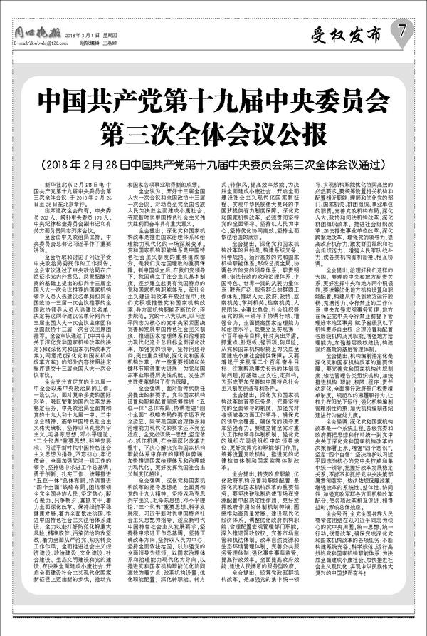 中国共产党第十九届中央委员会 第三次全体会议公报