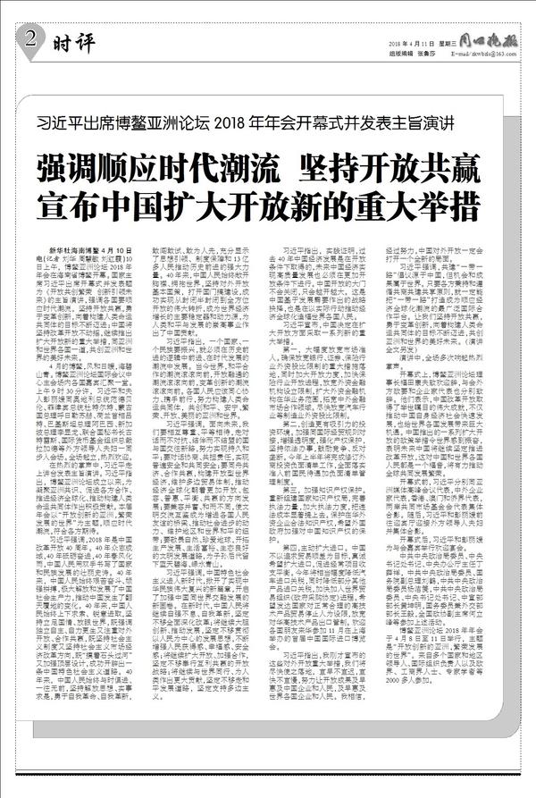 强调顺应时代潮流 坚持开放共赢 宣布中国扩大开放新的重大举措