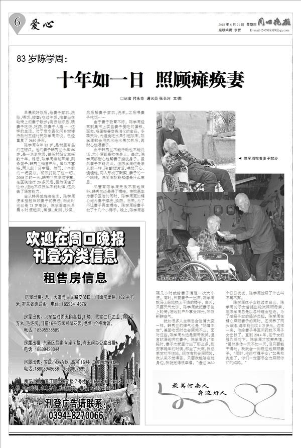 83岁陈学周:十年如一日 照顾瘫痪妻