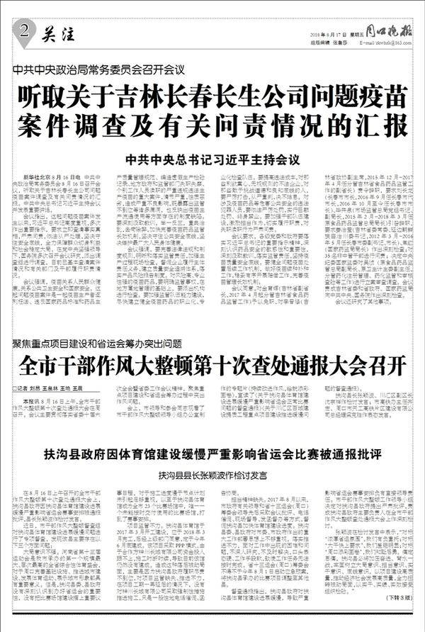 听取关于吉林长春长生公司问题疫苗案件调查及有关问责情况的汇报