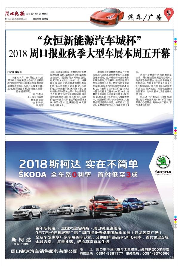 “众恒新能源汽车城杯”2018周口报业秋季大型车展本周五开幕