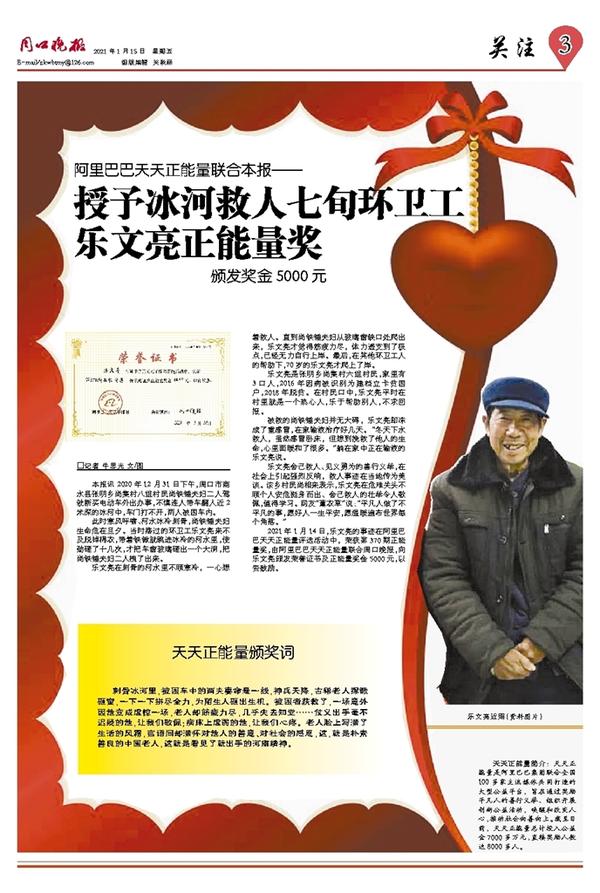 授予冰河救人七旬环卫工乐文亮正能量奖
