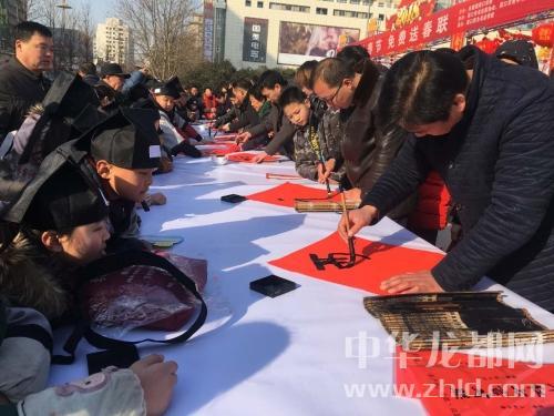 中华龙都网讯(周口报业全媒体记者 姬慧洋 文/图)2月8日上午,五一广场上人声鼎沸,喜气洋洋。来自我市书法家协会和市青年书法家协会的9名书法家带领近百名“小小书法家”在此挥毫泼墨,义写春联送市民。