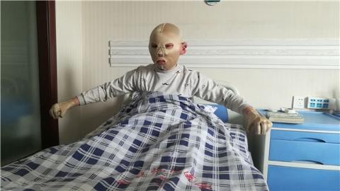 头套“捂”在脸上、头上,不仅仅是遮挡伤疤,更重要的是治疗需要,用来防止伤疤挛缩。头套非常闷热,但是翟新明默默承受着,只要能把自己变得漂亮一些,他克服困难配合医生治疗。即便是之前做手术,小新明也表现得非常坚强,这让医生们都伸出大拇指为他点赞。
