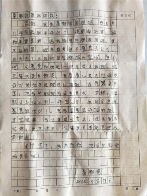 目前,翟新明唯一的玩伴,就是大他3岁的姐姐翟新想。对于弟弟遭遇的痛苦和内心的酸楚,懂事的姐姐感同身受。前几天,她提笔给医生写了一封催人泪下的书信,恳求医生把弟弟变回从前。