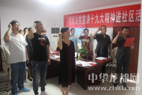 中华龙都网讯 (周口报业全媒体记者 牛勇威 通讯员 李康 文/图 )为深入学习宣传贯彻党的十九大精神,让十九大精神更好地惠及广大人民群众,6月11日下午,项城法院政治处、机关党委组织干警到项城市水寨办事处广场社区,组织开展“学习贯彻十九大,文明单位社区行”宣讲活动。项城市水寨办事处广场社区班子成员及来自社区的10余名党员和群众代表参加了此次活动。