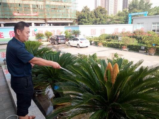6月23日下午,位于市区太昊路的市疾控中心院内,两名工作人员正在对所栽花木进行浇灌,其中,在办公楼门前两侧摆放的10多棵铁树苍绿茂盛,有3棵1米多高的铁树开出的淡黄色呈圆柱状的花在绿叶中显得尤为耀眼,并且开的都是双花。