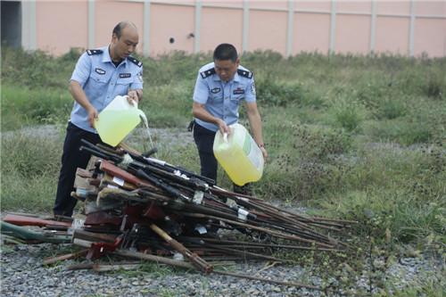 9月20日上午,周口市公安局在鹿邑县产业集聚区物流园举办“治枪爆、除祸患、保民安”主题活动,对全市公安机关在打击整治枪爆物品违法犯罪专项行动中收缴的223支非法枪支、263件枪支零部件进行集中展示和销毁。周口市公安局党委委员、治安和出入境管理支队支队长郭冰出席活动现场并讲话。市公安局治安和出入境管理支队副支队长张贝银主持活动,鹿邑县公安局政委任金瑞,周口各县市公安局(分局)治安大队长参加。